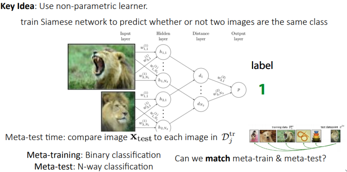 原本元训练是二分类问题,元测试是多分类问题,可以通过在高维学习到空间进行最近邻判断的方法将两者结合起来。 From Matching networks for one-shot learning.
